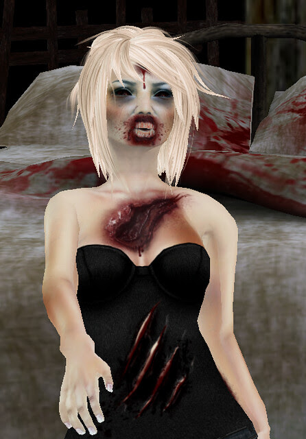 On my latest trip to Cinema, I picked up some more goodies I wanted to show you. First off, I LOVE this 'catfight bodysuit' by Miseria. I love the slashed and bloodied effect across the front, which I thought complemented evolve's bloody jeans perfectly! Throw in the latest zombie skin from Belleza, and voila a perfect zombie photo op!